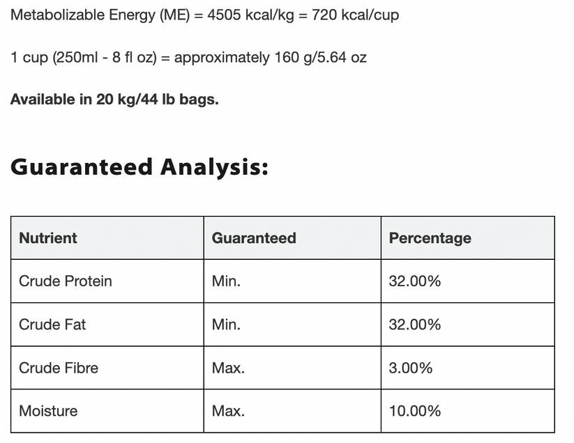 32/32 is designed for dogs with extreme energy demands and is not intended to be fed to household pets or puppies.